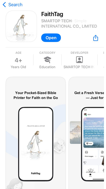 1. Turning on the Printer Hold the power button for about 3 seconds. Release when the power indicator light is on. 2. Installing the FaithTag App Download the "FaithTag" App either by visiting provided link or scanning the QR code below. Download the ...